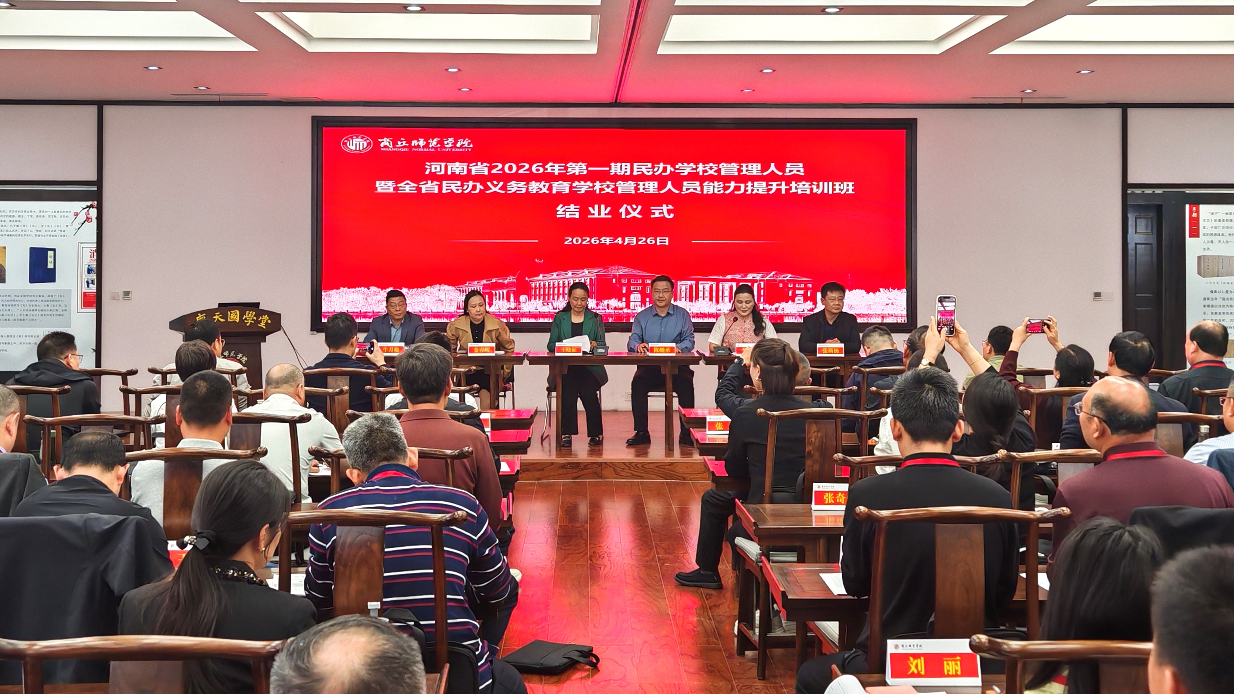 4月26日,2026年河南省第一期民办学校管理人员暨全省义务教育民办学校管理人员能力提升培训班结业仪式在梁园校区国学堂举行。省教育厅政策法规处处长陈继承、副校长王晓征出席结业仪式。