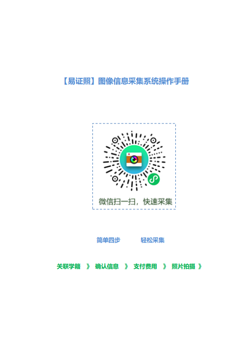 2.学生通过微信扫描下方二维码或微信搜索“易证照”按规定流程进行操作(具体操作流程见附件2)。提交后及时关注审核结果通知,如果审核未通过,请改正问题继续提交标准照片,直到审核通过即采集成功。